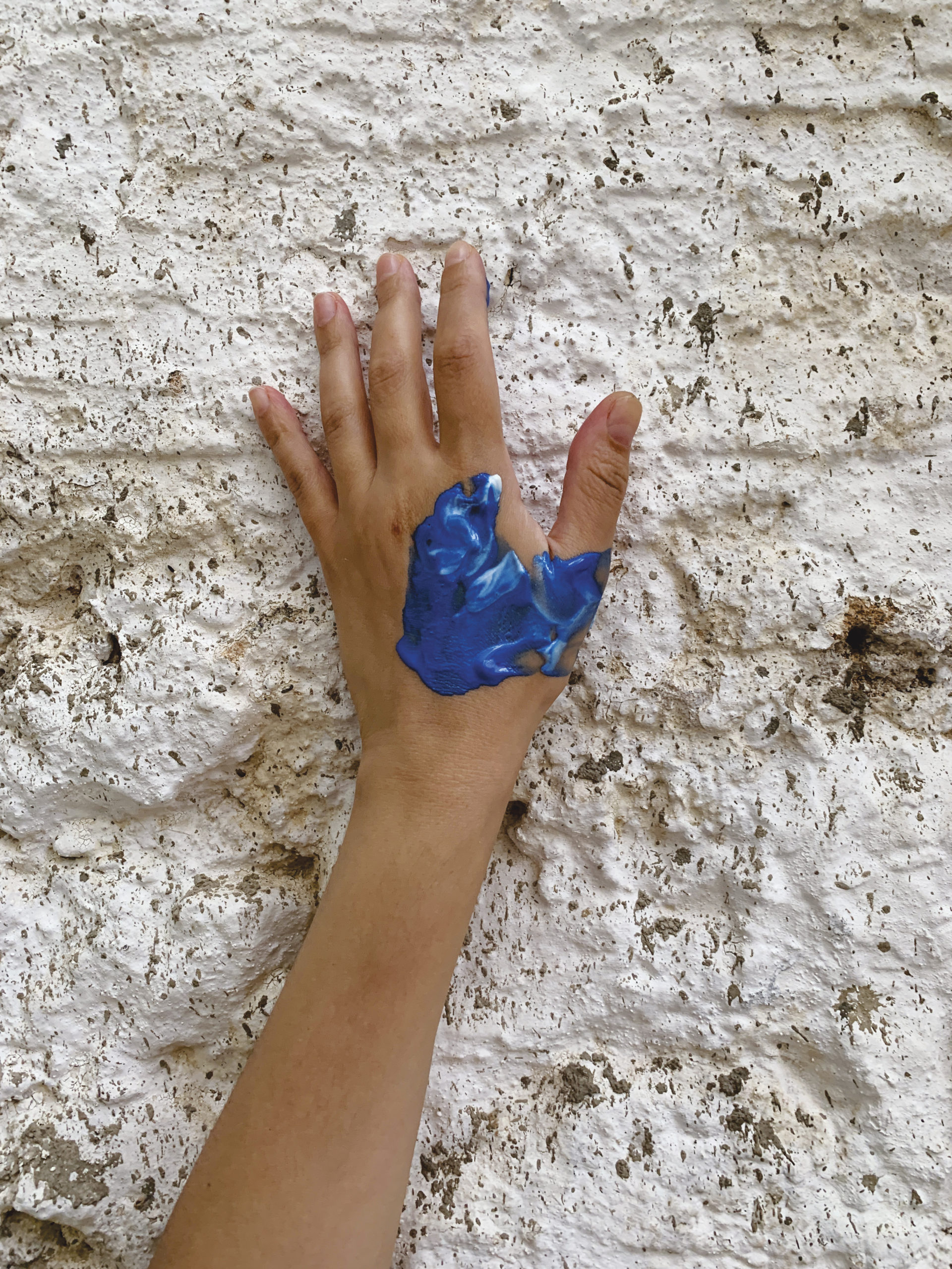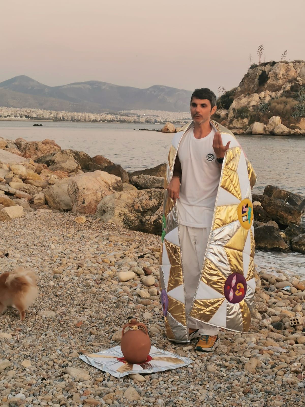 At the end of the cruise, on September 27th, a ritual happened on the beach of Votsalakia (Pireas River Beach—Athens) with the offering of a talismanic drinkable elixir part of the project A scene of a Blossom Head—a special commission Angelo Plessas had for the boat. While doing the ritual, Angelo Plessas wore a hand-made quilted vestment with special fabrics which function as Electromagnetic field “protectors.” The drink was made and conceived specifically for this purpose and made from natural elements that the artist collected from the uninhabited islands.