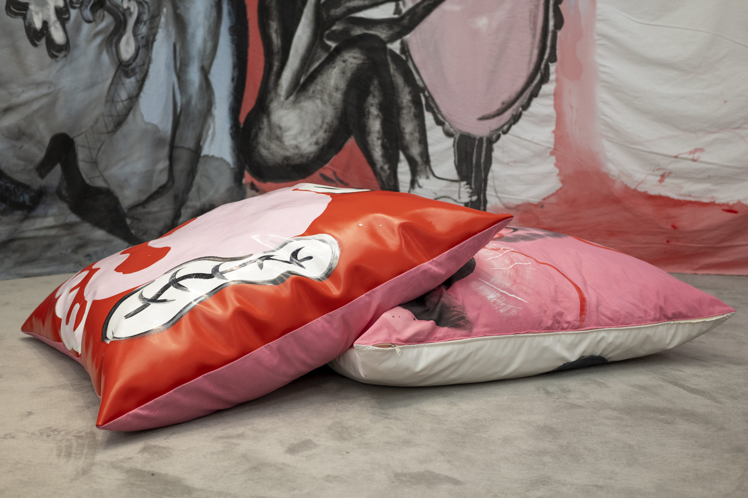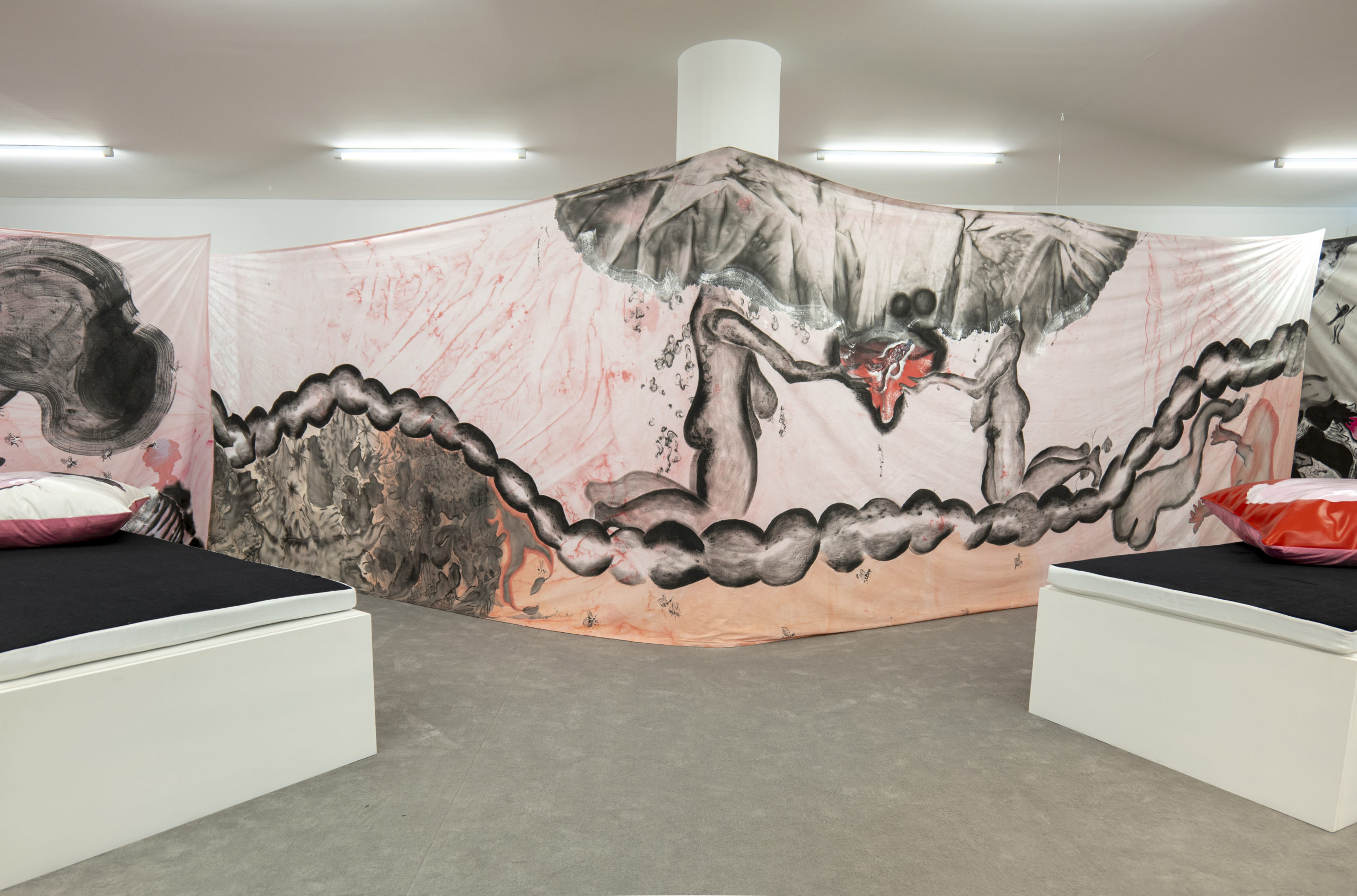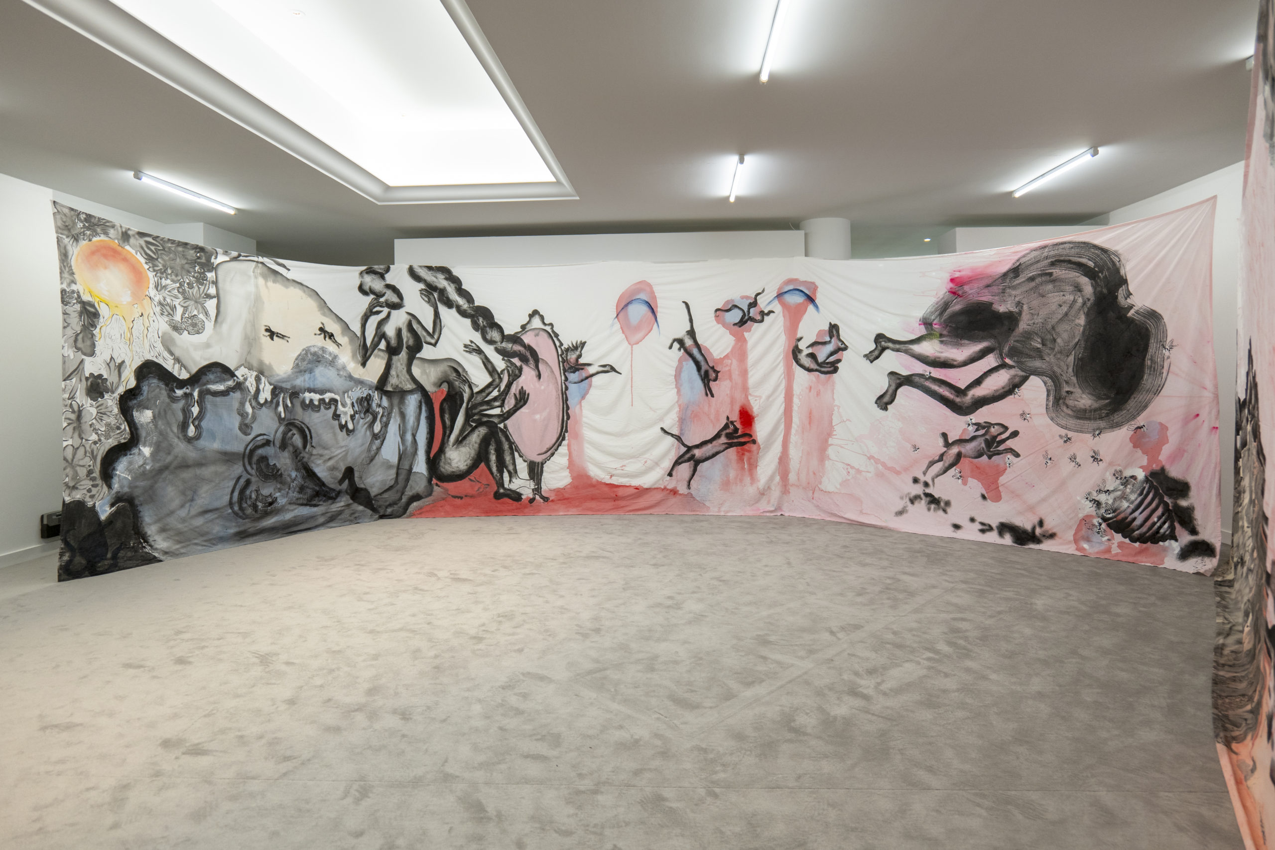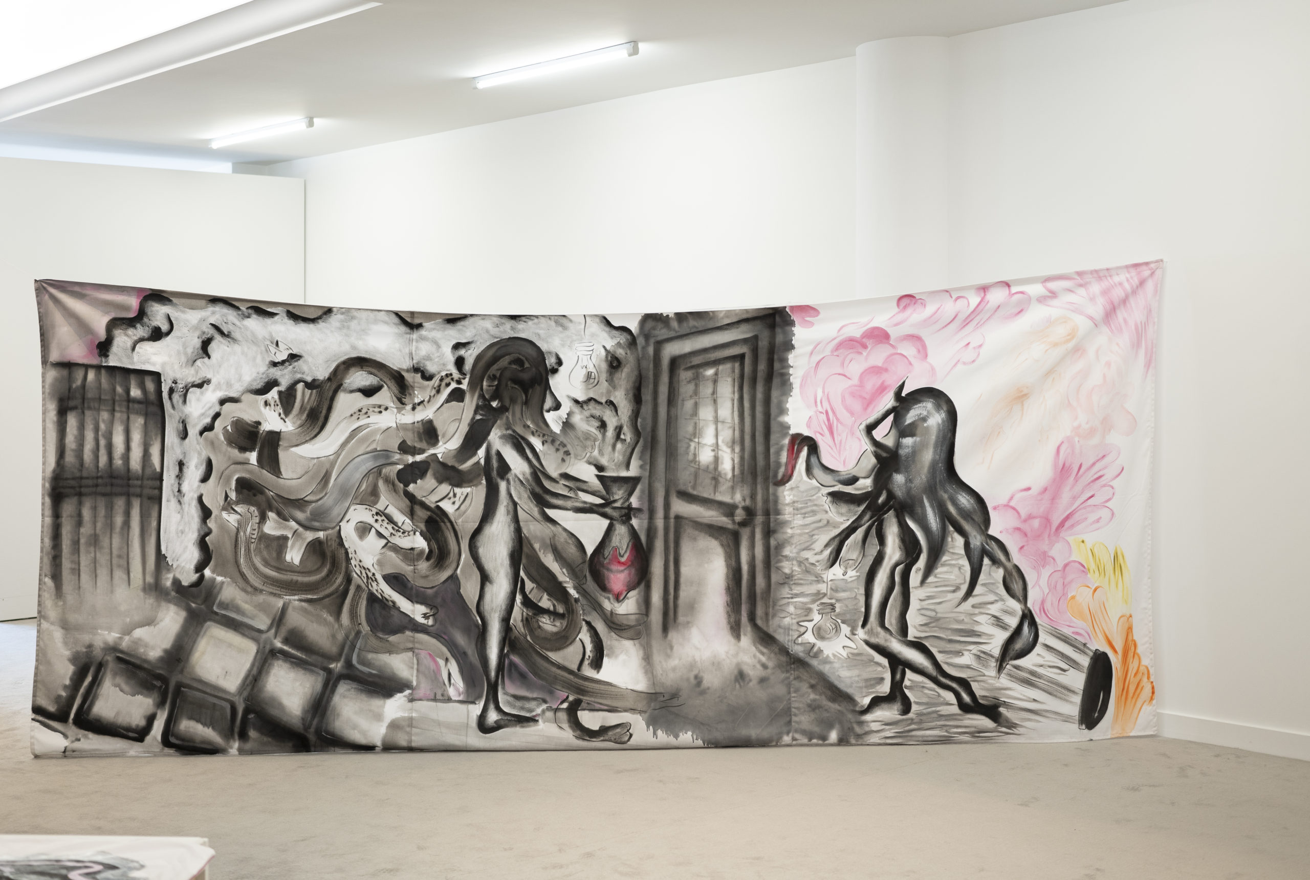 The exhibition consisted of several large paintings, hung directly on the wall and made with cotton fabrics. These large works, ranging from three to ten meters in length, are inspired by Japanese ukiyo-e prints, made in the Japanese city of Edo between the seventeenth and twentieth centuries, a period of wealth and peace, in which the art world was flourishing; Byzantine art and Greek culture are another important source of inspiration for these works (and part of the artist’s personal heritage): mythical, historical and fictional heroines such as Medea and Medusa appear through allegories, images and suggestions, giving life to dreamscapes where reality and fiction intertwine.