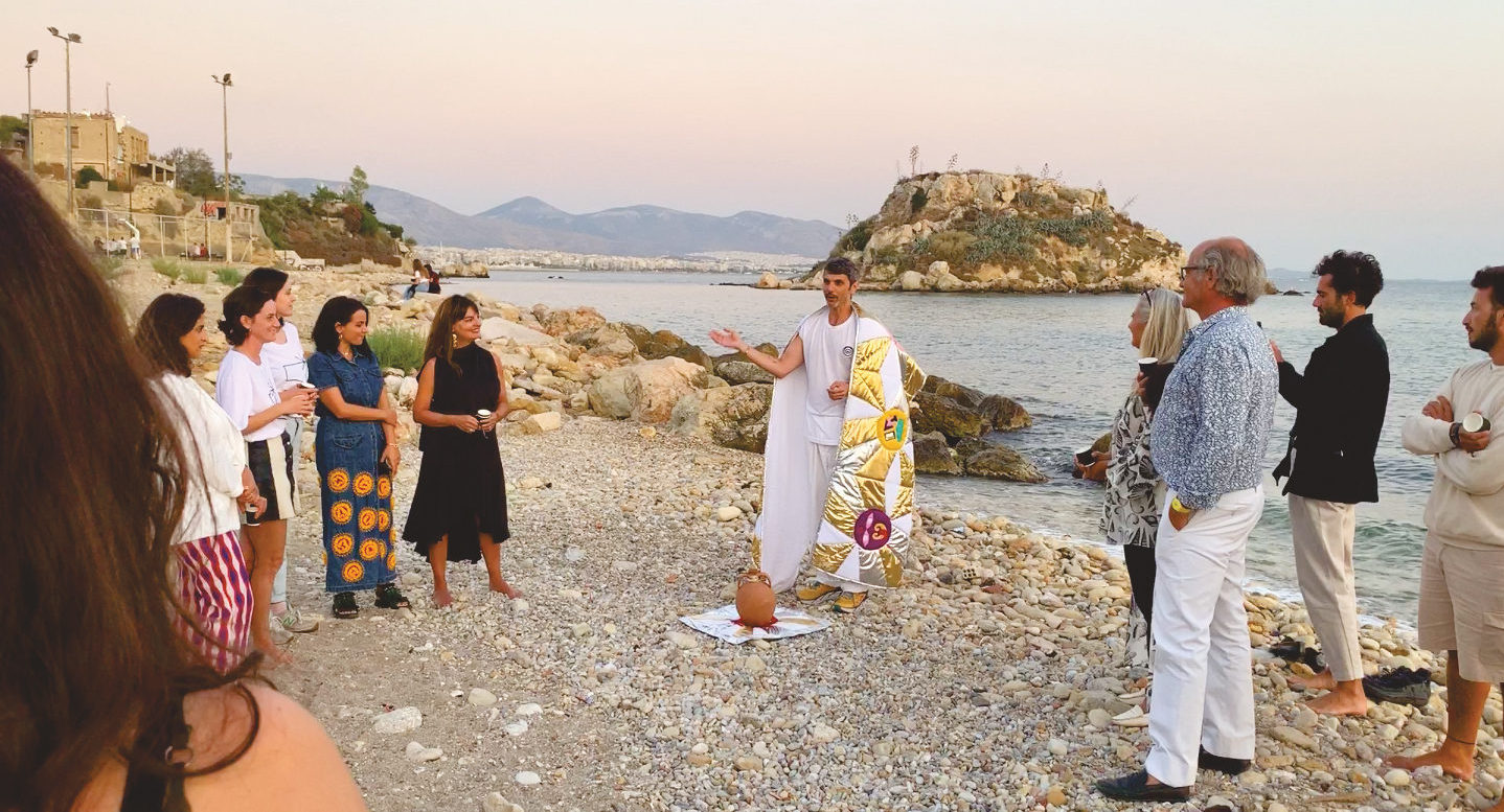 Un rituel de fin de croisière/fin de résidence a eu lieu sur la plage de Votsalakia (Pireas River Beach – Athènes), le 27 septembre 2019, et cela dans le cadre du projet A scene of a Blossom Head – un travail spécialement commandité, pour le bateau, à l’artiste Angelo Plessas. Pendant le rituel, Angelo Plessas portait un vêtement conçu pour l’occasion et fabriqué à la main, composé de tissus matelassés spéciaux qui ont la propriété de protéger des champs électromagnétiques. Lors de la cérémonie, l’artiste a officié et fait l’offrande d’un élixir talismanique, une boisson qui avait été conçue spécifiquement pour cette occasion et composée à partir d’éléments/ingrédients naturels collectés sur les îles inhabitées.